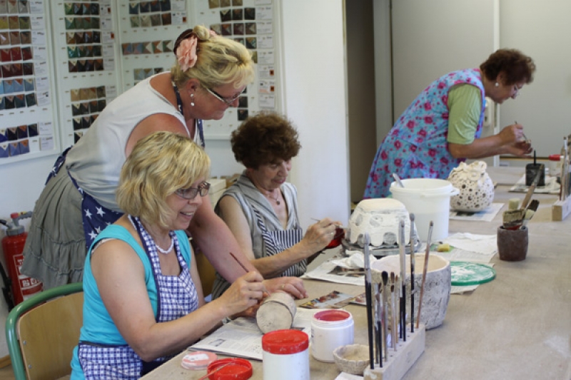 Viele Leute nehmen sich abends Zeit für ihr Hobby, andere wollen lieber am Vormittag aktiv werden. Für diese bietet Iris Schmiedel den Kurs an, der sich an interessierte Erwachsene wendet, die gern mit Ton arbeiten möchten. Gern werden Gefäße, auch mit Hilfe von Gipsformen, gefertigt. Nicht selten sind die Themen der Saison Anlass für die Gestaltungen: die Formen von Gräsern und Blättern im Herbst, Weihnachtsschmuck usw.