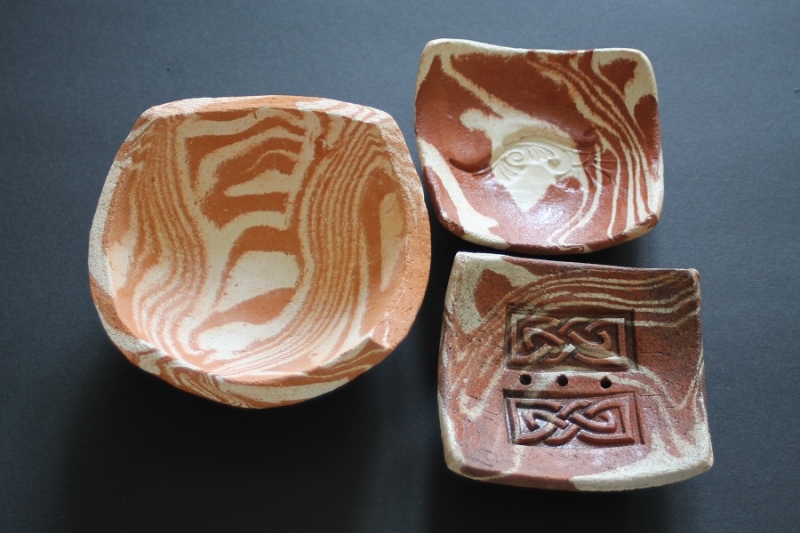 Durch Wiederholung dieses Vorgangs entsteht eine Marmoreffekt. Aus dem vorbereiteten Ton werden einfache Gegenstände hergestellt, bei denen das Muster gut zur Geltung kommt.