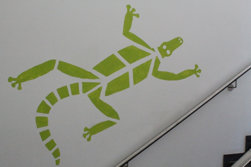 Die Schüler der 6. Klasse der GTA-Gruppe der Oberschule Oederan probierten Woche für Woche ganz unterschiedliche Möglichkeiten der Gestaltung ihres neuen Anbaus aus. Unter dem Thema "Bewegung" entschieden sie sich für eine großformatige Schablonierung.