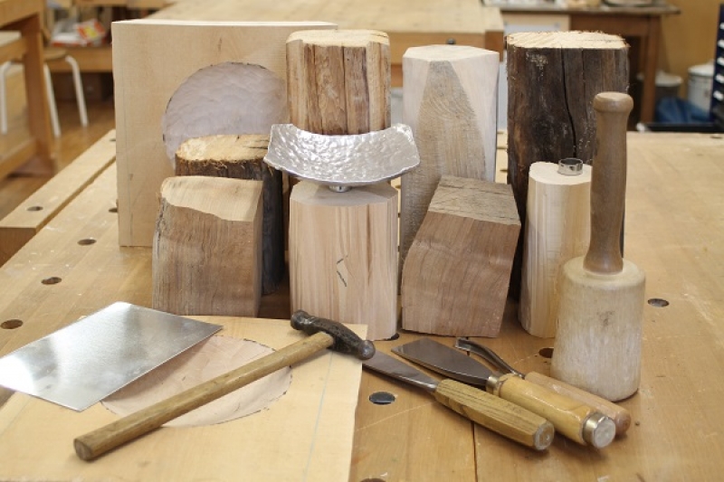 Mit Meisel und Klüpfel entstehen aus großen Holzstücken Leuchter. Dabei kommt zusätzlich die alte Technik des Blech Treiben zum Einsatz.
