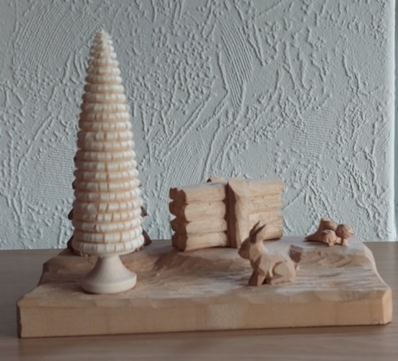 H-19 Drechseln und Schnitzen - Geschnitztes Waldmotiv mit gedrechselten Ringelbäumen