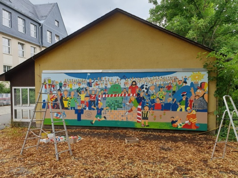 Fußball spielen ist unter Schülern beliebt, zumal in der Pause auf dem Schulhof. So entstand die Idee einer Torwand. Aber es sollte keine gewöhnliche Wand werden, sondern ein riesiges Gemälde an dem sich möglichst viele Kinder mit ihren Entwürfen und als Maler mit Farbe und Pinsel beteiligen. Den Höhepunkt fand die Fankurve im „AlleWeltZelt“ (eine Oederaner Aktion im Jahr der Kulturhauptstadt Chemnitz2025) auf dem Markt Oederan, das dabei zum Malatelier wurde. Beinahe täglich kamen die jungen Maler, um das Gemälde immer farbenfroher und detailreicher werden zu lassen. Jetzt schmückt das Gemälde der Schüler den Schulhof in Oederan.